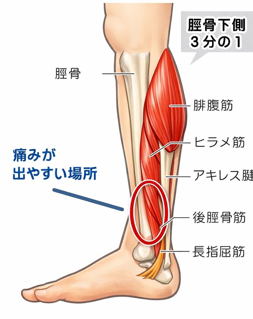 シンスプリントは下腿下1/3部分の脛内側後方に多く出ます。